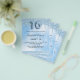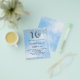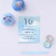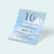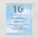 A modern, stylish and glamourous invitation for a girl's Sweet 16, 16th birthday party. A white and light blue sky as background with light blue faux glitter drip, paint dripping look. The name is written with a modern black coloured hand lettered style script. Personalise and add your party details. Number 16 is written with a balloon style font, script.
