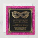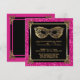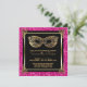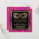 Elegant, sweet 16 hot pink, black, and gold masquerade ball birthday party invitations with faux pink glitter accents- Chic faux gold metallic look scrolls decorate the corners against a charcoal black background with faux gold metal look square frame and hot pink faux glitter border. A metallic gold colour, masquerade ball mask design adorns the top. Reads Please Join the Masquerade Ball Honouring in gold letters with personalised name below in chic, gold script. Other customised Sweet Sixteen party details below in gold hued lettering, including RSVP information. Text colours and styles may be changed to suit you. Back has matching gold scrolls in the corners with black and hot pink background. Note: All images are printed. Not actual metal, foil, glitter or confetti. Beautiful for black and pink theme, black and gold 16th birthday parties or Art Deco styles, as well as Great Gatsby glam themes.