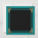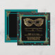 Elegant, sweet 16 black, teal and gold masquerade ball birthday party invitations with faux confetti and leather accents- Chic faux gold metallic look scrolls decorate the corners against a black background with teal and faux gold metal look square frame and faux black leather and teal confetti dots border. A metallic gold colour, masquerade ball mask design adorns the top. Reads 'Please Join the Masquerade Ball Honouring' in gold letters with personalised name below in chic, gold script. Other customised Sweet Sixteen party details below in gold hued lettering, including RSVP information. Text colours and styles may be changed to suit you. Back has matching gold scrolls in the corners with black and teal background. Note: All images are printed. Not actual leather, metal, foil, glitter or confetti. Beautiful for teal colour theme, black and gold 16th birthday parties or Art Deco styles, elegant Halloween costume party, as well as Great Gatsby glam themes.