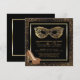 Elegant, black and gold sweet 16 birthday masquerade party invitations with faux gold glitter accents- Chic, faux gold metallic look frame with solid black background against a charcoal black border with faux gold glitter look. A metallic gold colour, masquerade ball mask design adorns the top. In the bottom, left corner a pair of stylish, faux gold glitter high heel shoes is displayed. Reads Please Join the Masquerade Party Honouring in gold letters with personalised name below in chic, gold script. A simple gold divider separates the name from other customised Sweet Sixteen party details below in gold hued lettering, including RSVP information. Text colours and styles may be changed to suit you. Back has matching frame against a solid black background. Beautiful for black and gold theme 16th birthday party or Art Deco styles, as well as Great Gatsby glam themes.