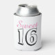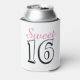 This sweet and simple design is perfect for a girl's sweet 16 birthday gift can cooler. The design features the text "Sweet 16" in modern typography of pink and black.