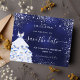 A girly and trendy Save the Date card for a Sweet 16, 16th birthday party. A navy blue background decorated with faux silver glitter, sparkles and a dress. The blue colour is uneven. Personalise and add a date and name/age. The text: Save the Date is written with a large trendy hand lettered style script.