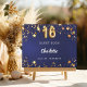 Atrendy navy blue, uneven coloured background with faux gold stars. Add your name, and text. Age number is written with a balloon style font.