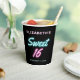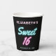 Cool paper cups for her sixteenth birthday party with "Sweet 16" written in hot pink and teal script with a neon lights effect against a black background. Customise with her name and birthday date.