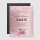 A blush pink gradient background decorated with faux sparkles, confetti and a romantic vintage carriage. Personalise and add her name, party details.