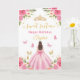 Celebrate her Sweet 16 with this elegant princess birthday card featuring a brunette girl in a sparkling blush pink ball gown, illustrated gracefully from the back. Soft florals, fluttering butterflies, and a regal gold crown create a magical and feminine look perfect for this milestone birthday. The blush pink and gold color palette adds timeless charm, making this a beautiful keepsake card she’ll treasure long after the celebration.