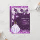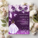 For an elegant Sweet 16 birthday. A purple uneven coloured background. Decorated with confetti, ballerina toe shoes, butterflies, roses and a girl in a dress. Personalise and add a name, age/text and party details. The name is written with a hand lettered style script