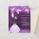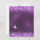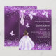 For an elegant Sweet 16 birthday. A purple uneven coloured background. Decorated with confetti, ballerina toe shoes, butterflies and a girl in a dress. Personalise and add a name, age/text and party details. The name is written with a hand lettered style script.