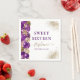 This Sweet 16 birthday party napkin features balloons in various shades of purple and gold. Gold glitter corners complete the party vibe. Easy to customise by clicking "Personalise".