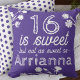 Purple Sweet 16 birthday commemorative throw pillow has darling white wild flowers and purple polka dots on the back. Easily change the purple background colour to any other colour that perfectly matches your Sweet 16 theme. White font and white wild flowers can also be changed to any colour.