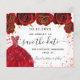 A girly and trendy Save the Date for a Sweet 16, 16th birthday party. A white background decorated red roses, red faux glitter sparkles and a red dress. Personalise and add a date and name/age. The text: Save the Date is written with a large trendy hand lettered style script.