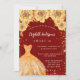 A modern, stylish and glamourous invitation for a Sweet 16, 16th birthday party. A red background with faux gold glitter dust, a dress and golden roses, flowers. The name is written with a modern hand lettered style script. Personalise and add your party details.