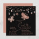 Sweet 16 Rose Gold Butterfly Chic Modern Birthday Invitations features elegant rose gold butterflies with string lights on a black background with your Sweet 16 Invitation information below. Personalise by editing the text in the text boxes. Designed for you by ©Evco Studio www.zazzle.com/store/evcostudio