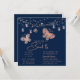 Sweet 16 Rose Gold Butterfly Chic Modern Birthday Invitations features elegant rose gold butterflies with string lights on a blue background with your Sweet 16 Invitation information below. Personalise by editing the text in the text boxes. Designed for you by ©Evco Studio www.zazzle.com/store/evcostudio