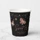 Sweet 16 Rose Gold Butterfly Chic Modern Birthday Paper Cups features elegant rose gold butterflies with string lights on a black background with Sweet 16 in elegant calligraphy script with "Happy Birthday" and personalised with your custom name below. Personalise by editing the text in the text boxes. Designed for you by ©Evco Studio www.zazzle.com/store/evcostudio