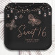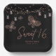 Sweet 16 Rose Gold Butterfly Chic Modern Birthday Paper Party Plates features elegant rose gold butterflies with string lights on a black background with Sweet 16 in elegant calligraphy script and personalised with your name and date below. Personalise by editing the text in the text boxes. Designed for you by ©Evco Studio www.zazzle.com/store/evcostudio
