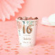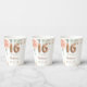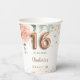 For an elegant Sweet 16, 16th birthday party. A white background. On the front and the back: Personalise and add a name and a date. Decorated watercolored rose gold and blush pink florals, eucalyptus greenery and faux glitter dust. Nr 16 is written with a balloon style font.