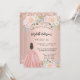 A modern, stylish and glamourous invitation for a Sweet 16, 16th birthday party. A rose gold background with blush pink flowers, a girl wearing a ball gown. The name is written with a modern hand lettered style script. Personalise and add your party details.