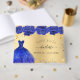 For a Sweet 16, 16th birthday party. A golden background with blue and faux gold glitter sparkles, a royal blue dress and blue roses, florals. The name is written with a modern hand lettered style script with swashes. Personalise and add a name and date.