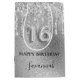 Elegant, classic, glamourous and girly for a Sweet 16, 16th birthday party. A faux silver metallic background. Decorated with faux glitter drips, paint dripping look. Personalise and add a name. With the text: Happy Birthday. The name is written with a modern hand lettered style script. Number 16 is written with a balloon style font.