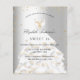 A modern, stylish and glamourous invitation for a Sweet 16, 16th birthday party. A faux silver metallic looking background with faux gold glitter sparkles and a white dress. The name is written with a modern hand lettered style script. Personalise and add your party details.