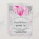 For an elegant Sweet 16, 16th birthday. A faux silver looking background. Decorated with pink and faux silver glitter and balloons. Personalize and add a name, age and party details. The name is written with a hand lettered style script.