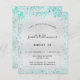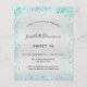 For an elegant Sweet 16, 16th birthday. A faux silver looking background. Decorated with teal faux glitter dust. Personalise and add a name, age and party details. The name is written with a hand lettered style script