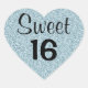 Sweet 16 heart sticker with glam light blue silver glitter sparkles and bold black writing.