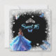 Elegant sweet sixteen invitation with silver glitter frame, pretty butterflies, crown, white hearts and girl wearing a gorgeous sparkling blue and pink gown. Her shoes are pink and blue sparkle high heels. Lovely silver princess crown and Sweet Sixteen in an elegant font.