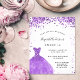 A modern, stylish and glamourous invitation for a Sweet 16, 16th birthday party. On the front: A white background with violet, lilac sparkles, a violet dress. The name is written with a modern hand lettered style script. Personalise and add your party details.