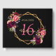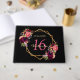 A Guest Book for a Sweet 16th birthday party. A chic black background with a faux gold geometric frame. Decorated with dark purple and burgundy flowers, roses and boho style feathers. Templates for a name, age 16 and a date. Date of birth or the date of the party. The name is written with a hand lettered style script, pink coloured letters, age 16 in purple and the date with golden numbers. Text on the spine.
