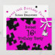 Great 16th Birthday party invitations for the young lady who happens to love puzzles. Sweet sixteen with black puzzle pieces and white polka dots on fuchsia pink background and large white ribbon