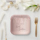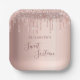 A paper plate for a girly and glamourous Sweet 16, 16th birthday party. A rose gold gradient background with faux glitter drips, paint dripping look. The text: Sweet Sixteen is written in dark rose gold with a modern hand lettered style script. Personalise and add a name.