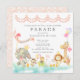 Adorable baby shower invitation featuring a parade of animals with crowns, balloons, musical instruments & bunting banners. Perfect design for a virtual drive by baby shower.