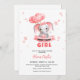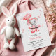 Adorable baby shower invitation featuring a cute baby elephant holding pink heart-shaped balloons, surrounded by delicate stars. The soft watercolor-style design in pastel pink and grey creates a sweet and dreamy atmosphere, perfect for celebrating the arrival of a little one. A lovely pink ribbon banner at the bottom provides space for customisation, making it ideal for a baby girl’s shower.