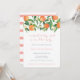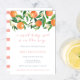 Fresh watercolor oranges and glossy green leaves with a striped reverse for this modern baby shower invite design.