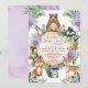 Celebrate the upcoming arrival of your little baby girl with this whimsical woodland themed baby shower invitation. The design features a group of adorable forest friends (deer, bear, racoon, fox, owl, bunny, skunk and squirrel), pretty purple peonies and lush watercolor greenery.