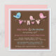A cute mum and dad bird holds the clothesline where their little baby girl is perched - an adorable design that's absolutely perfect for a couples baby shower - and when a girl is on the way.