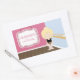 This girls birthday party rectangle sticker has a cute ballerina theme. This has a blonde haired ballerina practicing in front of a mirror in her ballet dance studio. On the left, there is a frame where you can personalise the name of the birthday girl along with how old she is turning. Some Graphics by Zenware Designs at MyGrafico.com