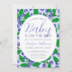 This cute blueberry baby shower invitation template, features blue blueberries on green leafy vines with white flowers. A modern calligraphy script font adds a touch of whimsy to this sweet summer baby shower invitation.