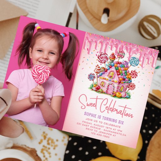 Sweet Celebration Candyland Photo Kids Birthday Banner. Design featuring calligraphy script ''sweet celebration'' in trendy pink, candy house on a pastel pink background with colourful sprinkles and single photo on the front. Personalise with a name and party details.
