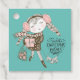 Whimsical and hand drawn illustration of winter outfitted girl, carrying Christmas present, walking with her dog, and curvy "Sweet Christmas Wishes" text. Aqua background.
