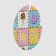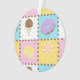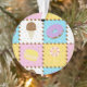 Satisfy your sweet tooth with this colourful pattern featuring tasty treats like a chocolate ice cream cone, a purple frosted chocolate doughnut, a lemon yellow macaron, and a pink and white swirled lollipop separated by chocolate chips and surrounded by rainbow sprinkles on four brightly hued squares.