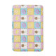 Satisfy your sweet tooth with this colourful pattern featuring tasty treats like a chocolate ice cream cone, a purple frosted chocolate doughnut, a lemon yellow macaron, and a pink and white swirled lollipop separated by chocolate chips and surrounded by rainbow sprinkles on four brightly hued squares.