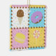 Satisfy your sweet tooth with this colourful pattern featuring tasty treats like a chocolate ice cream cone, a purple frosted chocolate doughnut, a lemon yellow macaron, and a pink and white swirled lollipop separated by chocolate chips and surrounded by rainbow sprinkles on four brightly hued squares.