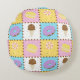Satisfy your sweet tooth with this colourful pattern featuring tasty treats like a chocolate ice cream cone, a purple frosted chocolate doughnut, a lemon yellow macaron, and a pink and white swirled lollipop separated by chocolate chips and surrounded by rainbow sprinkles on four brightly hued squares.