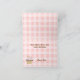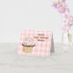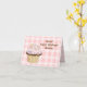 Whimsical birthday greeting card, with a pretty chocolate cupcake decorated, with pink frosting, and colourful hearts, set on a pink and white gingham background. Fun brown text, at the top reads, Sweet Happy Birthday Wishes. Personalise the text inside and out with your own greeting and name.