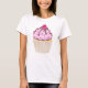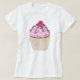 T-shirt with an illustration of a delicious looking cupcake. Pink frosting and chocolate drizzles. A yellow cupcake holder and a raspberry on top. Yummy!