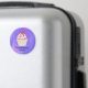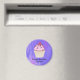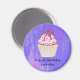 A birthday magnet personalised with a name and designed with an illustration of a delicious looking cupcake. Pink frosting and chocolate drizzles. A yellow cupcake holder and a raspberry on top. Yummy! The background is a purple abstract texture with little hearts sprinkled around.