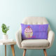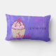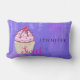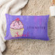 A personalised lumbar pillow with an illustration of a delicious looking cupcake. Pink frosting and chocolate drizzles. A yellow cupcake holder and a raspberry on top. Yummy! Text says Sweet The background is a purple abstract texture with little hearts sprinkled around.